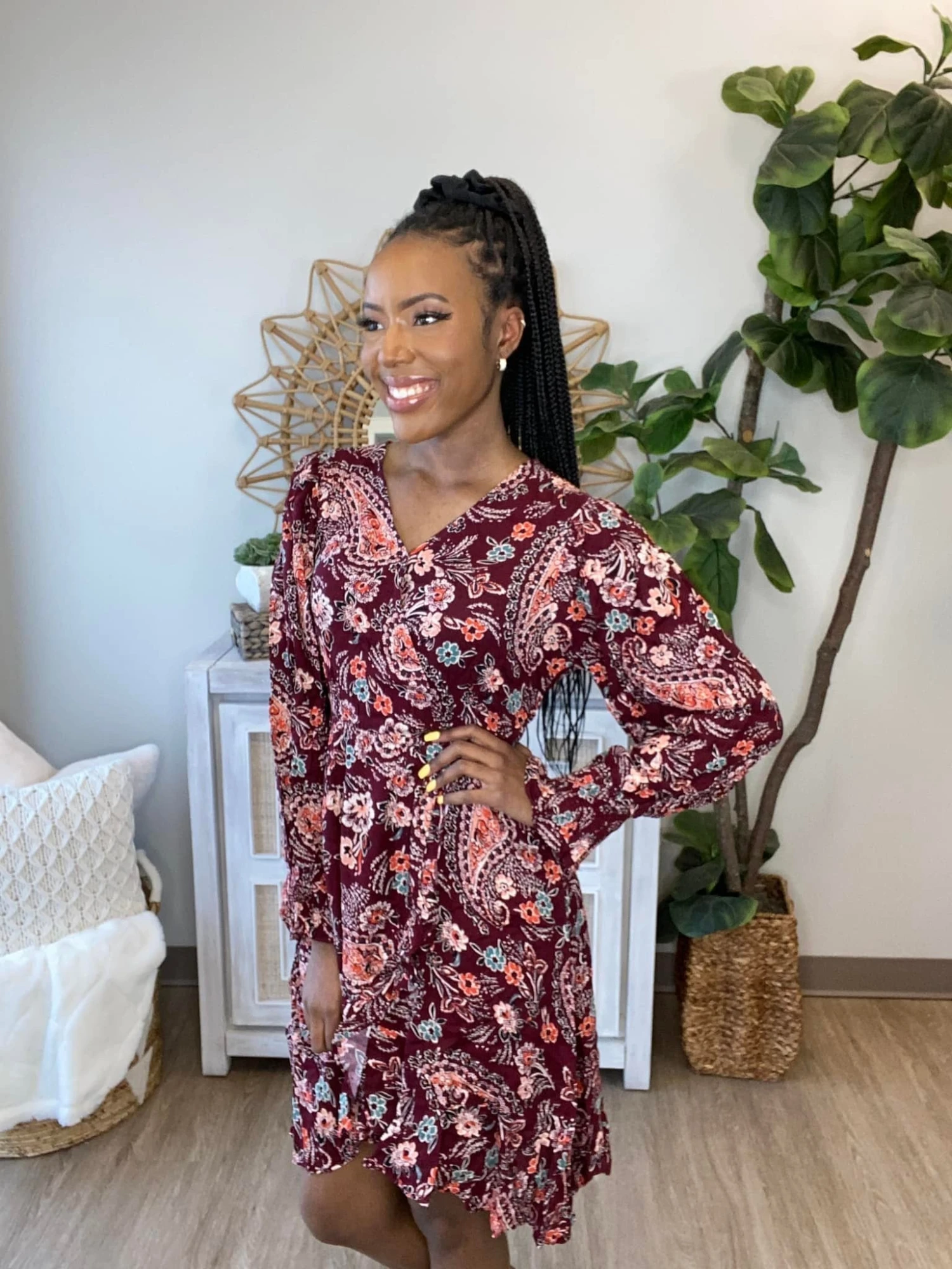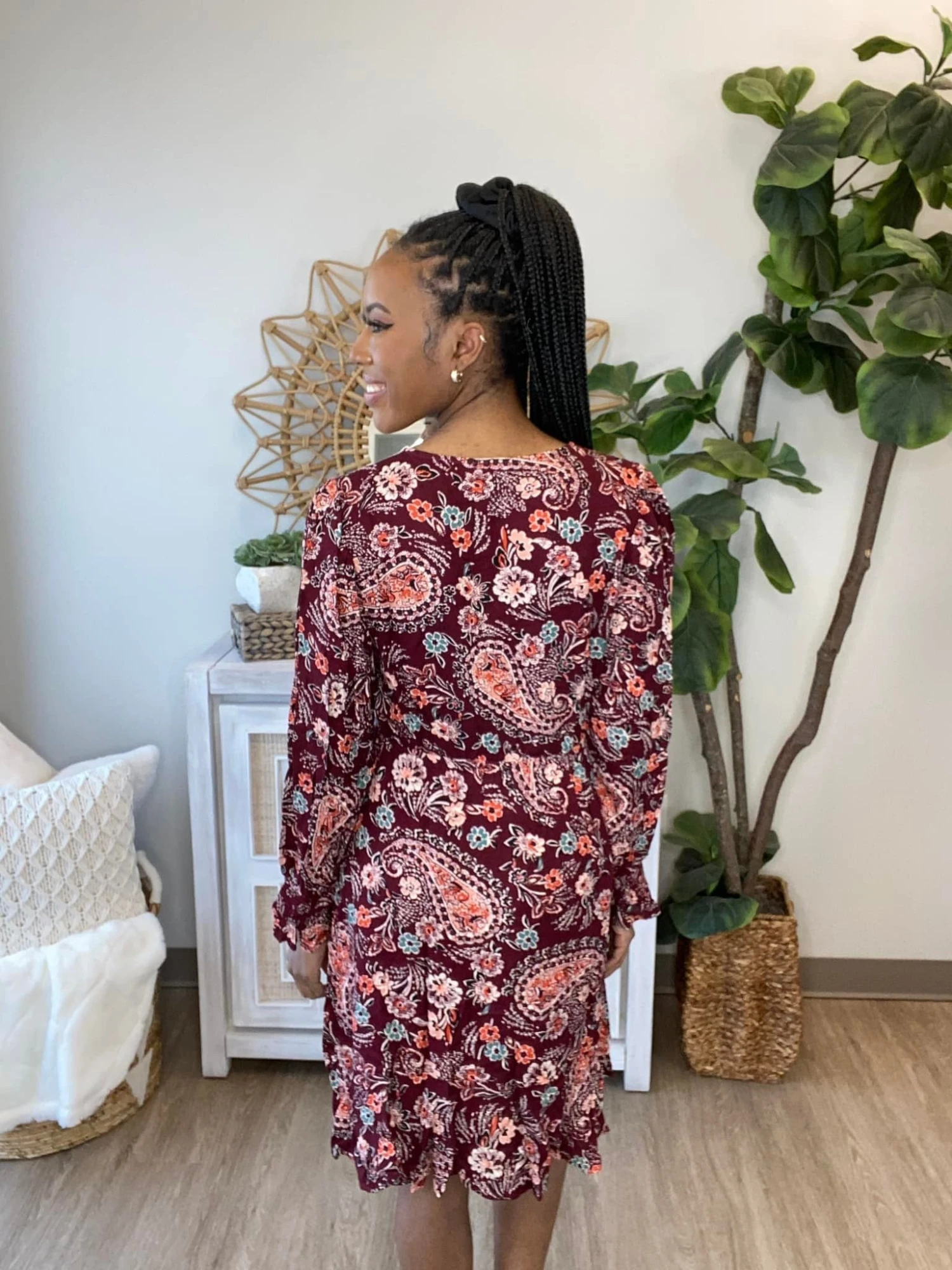 Features: paisley print, long sleeve, v neck, surplice babydoll, smocked cuffs