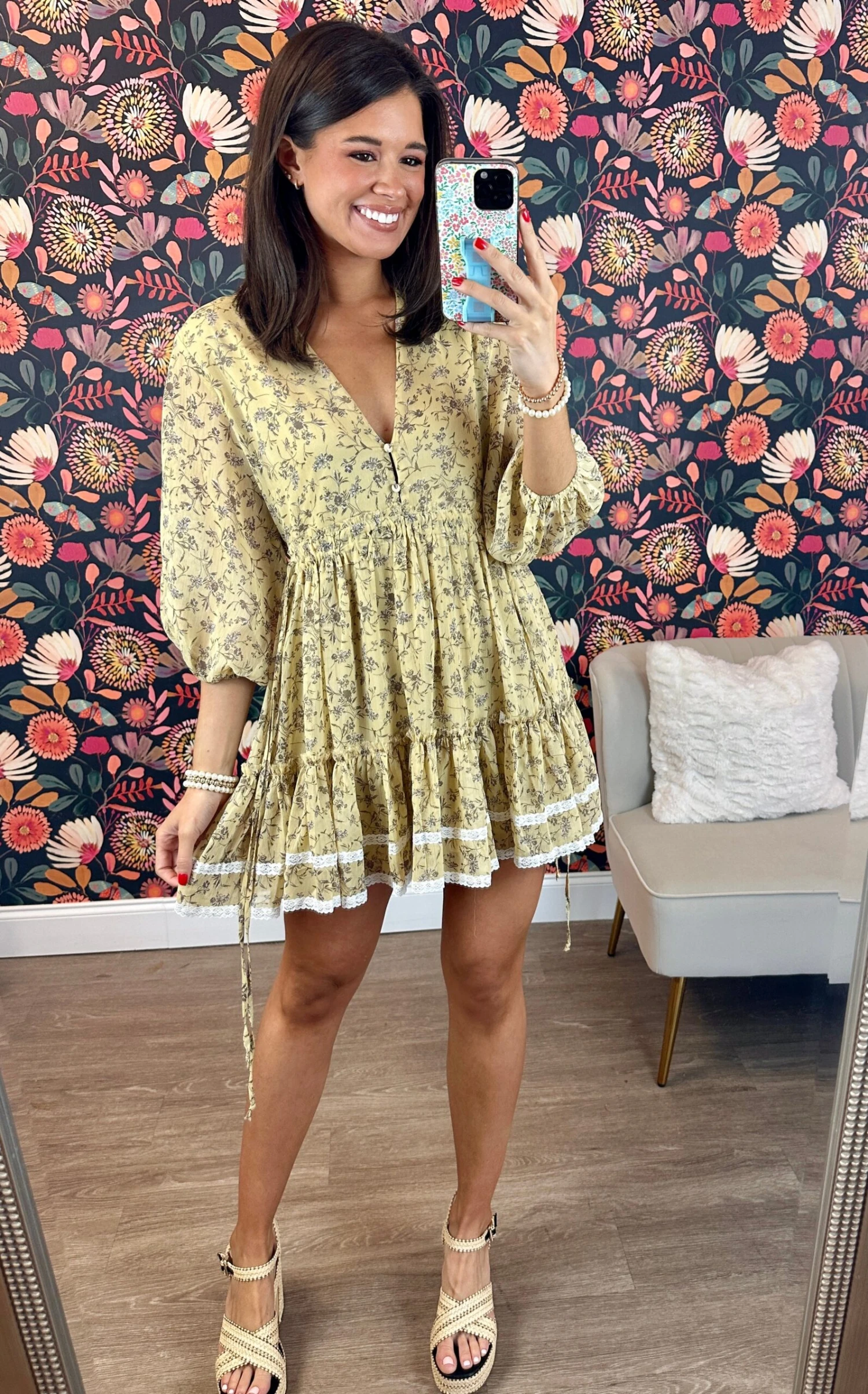 Features: 3/4 Sleeves, V Neck, Floral Print, Babydoll