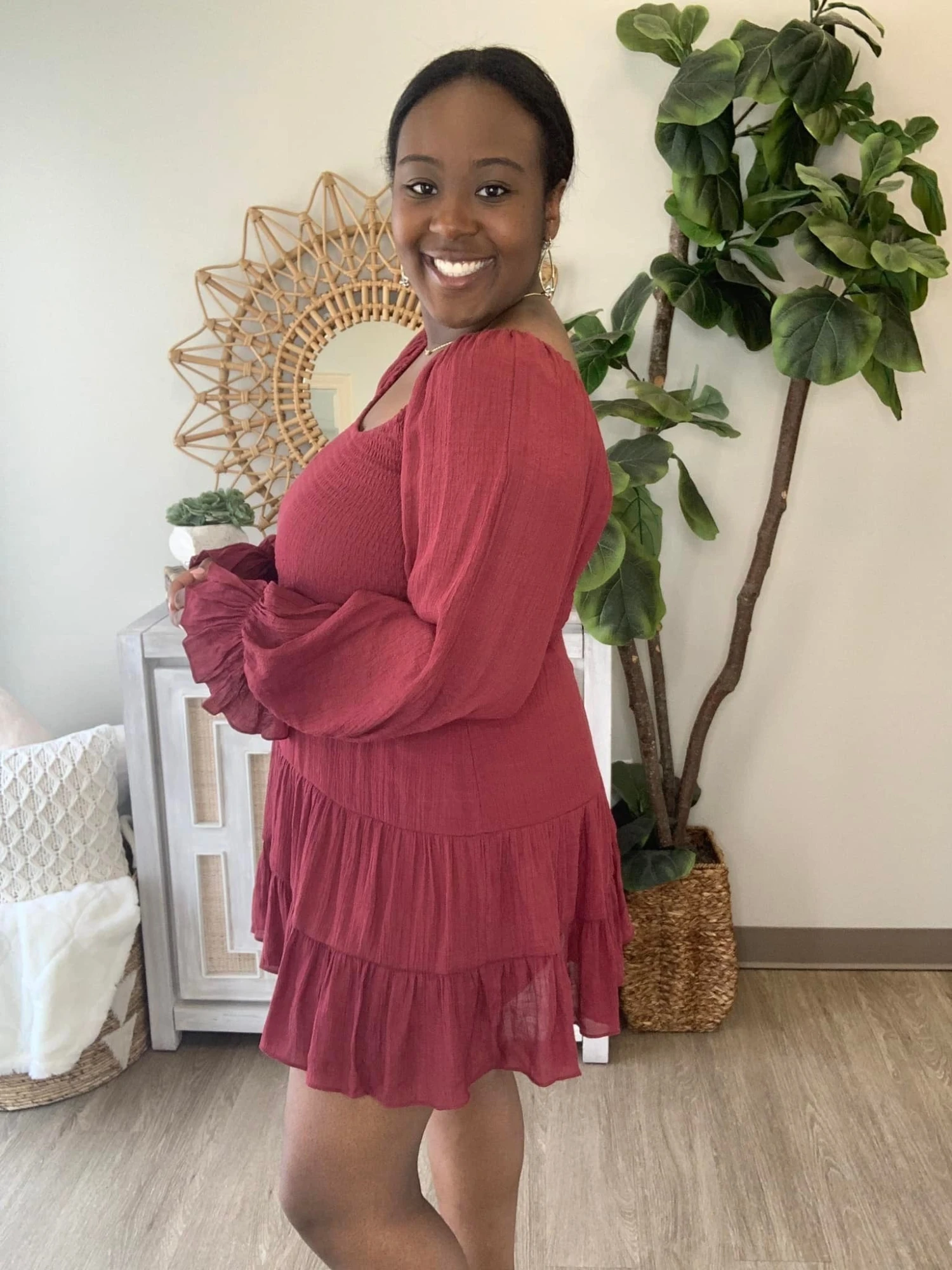 Emry: 5’5’ XL/L in tops and dresses, Size 14 In bottoms