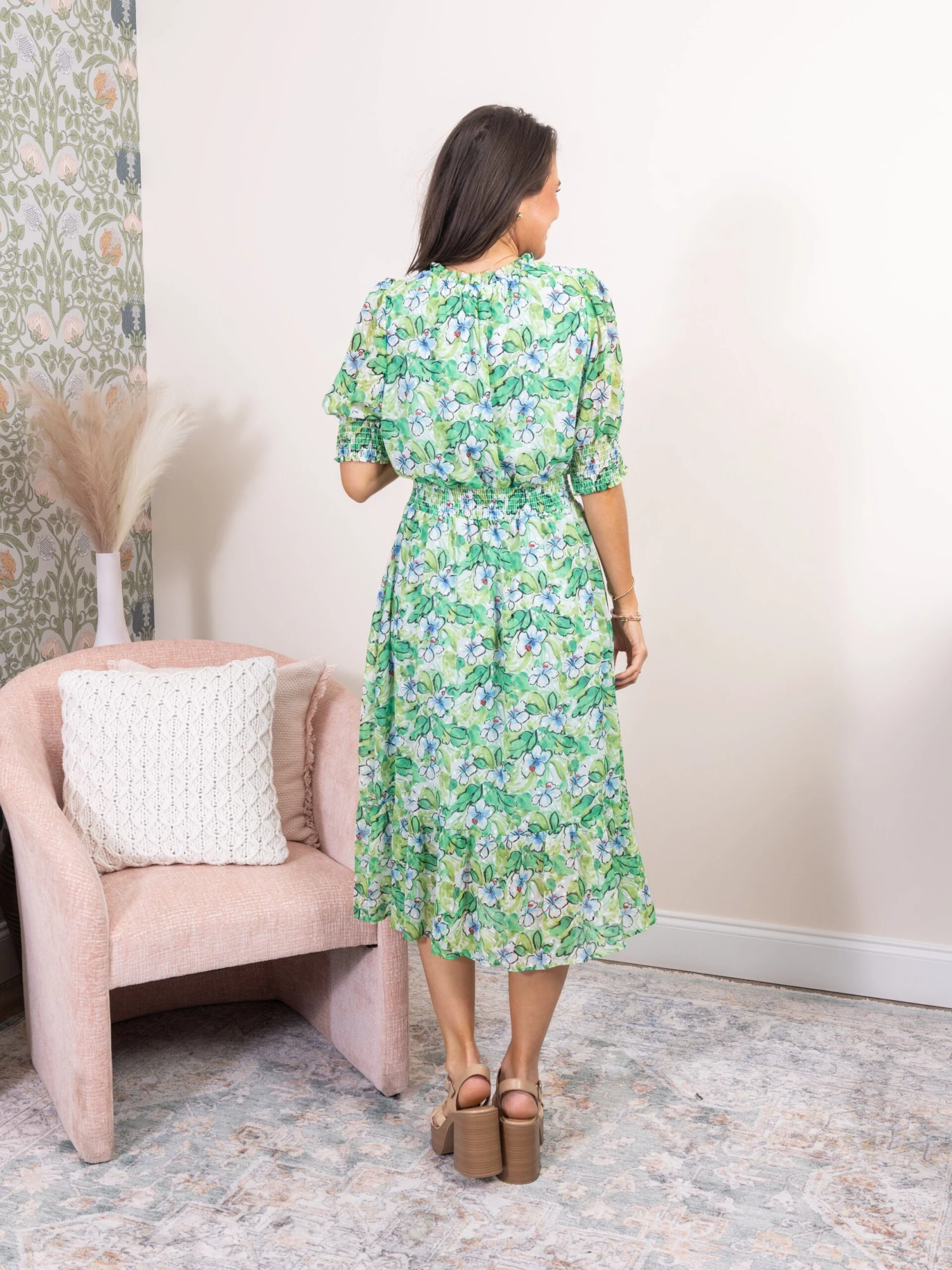 Features: Ruffle Neck, Short Sleeves, Lined, Floral Print