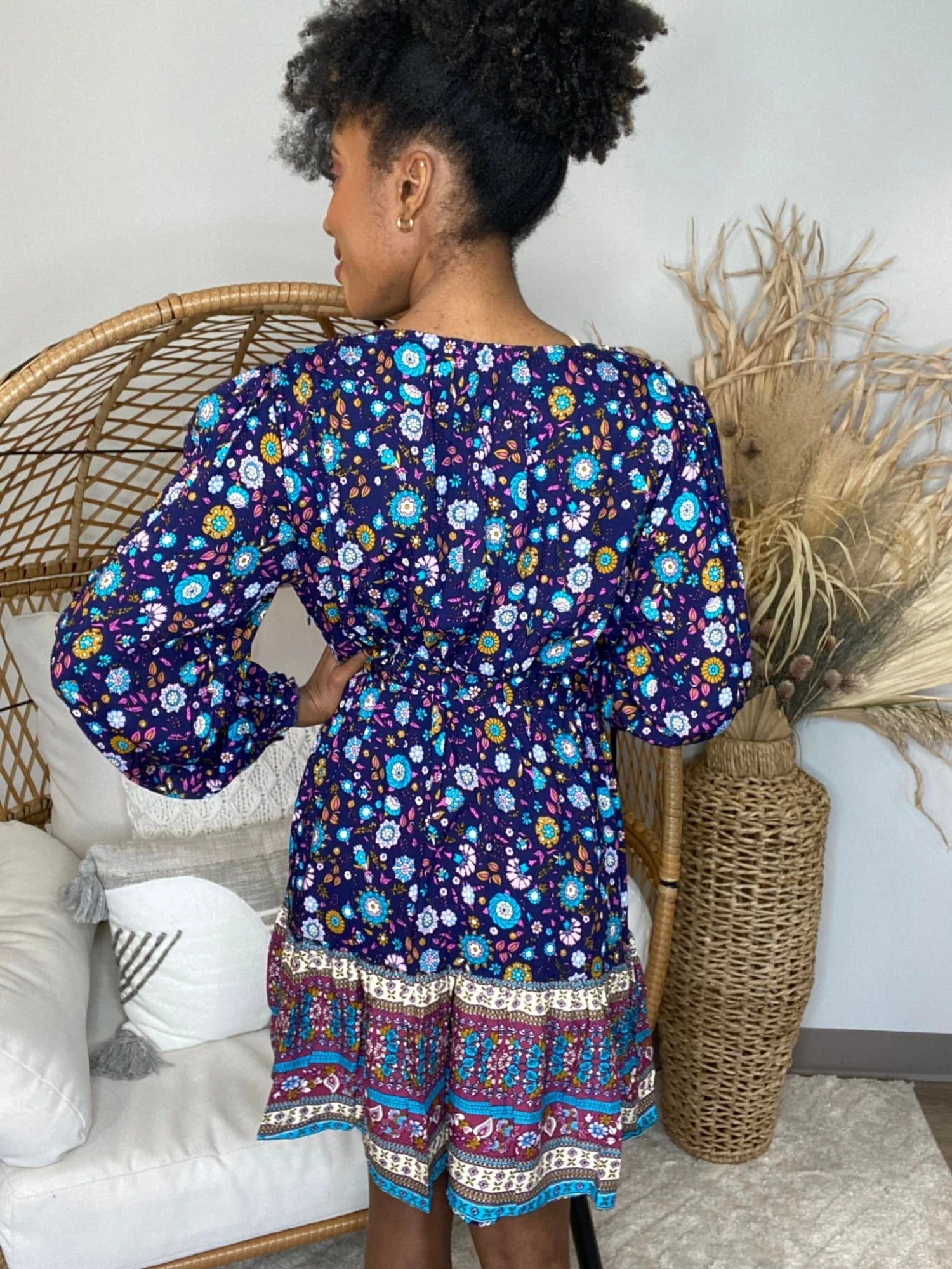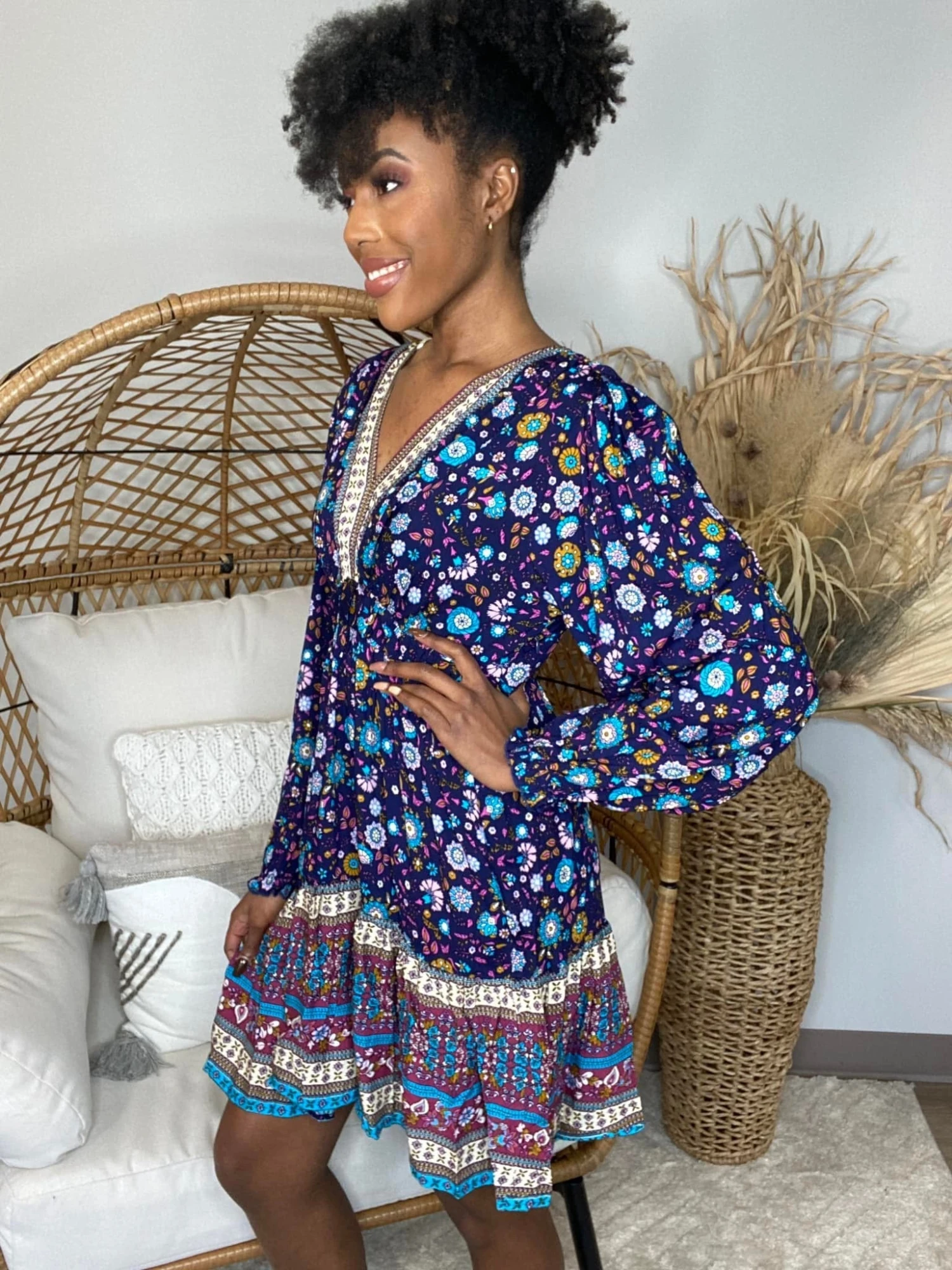 Features: floral border print, v neck, babydoll, long sleeve