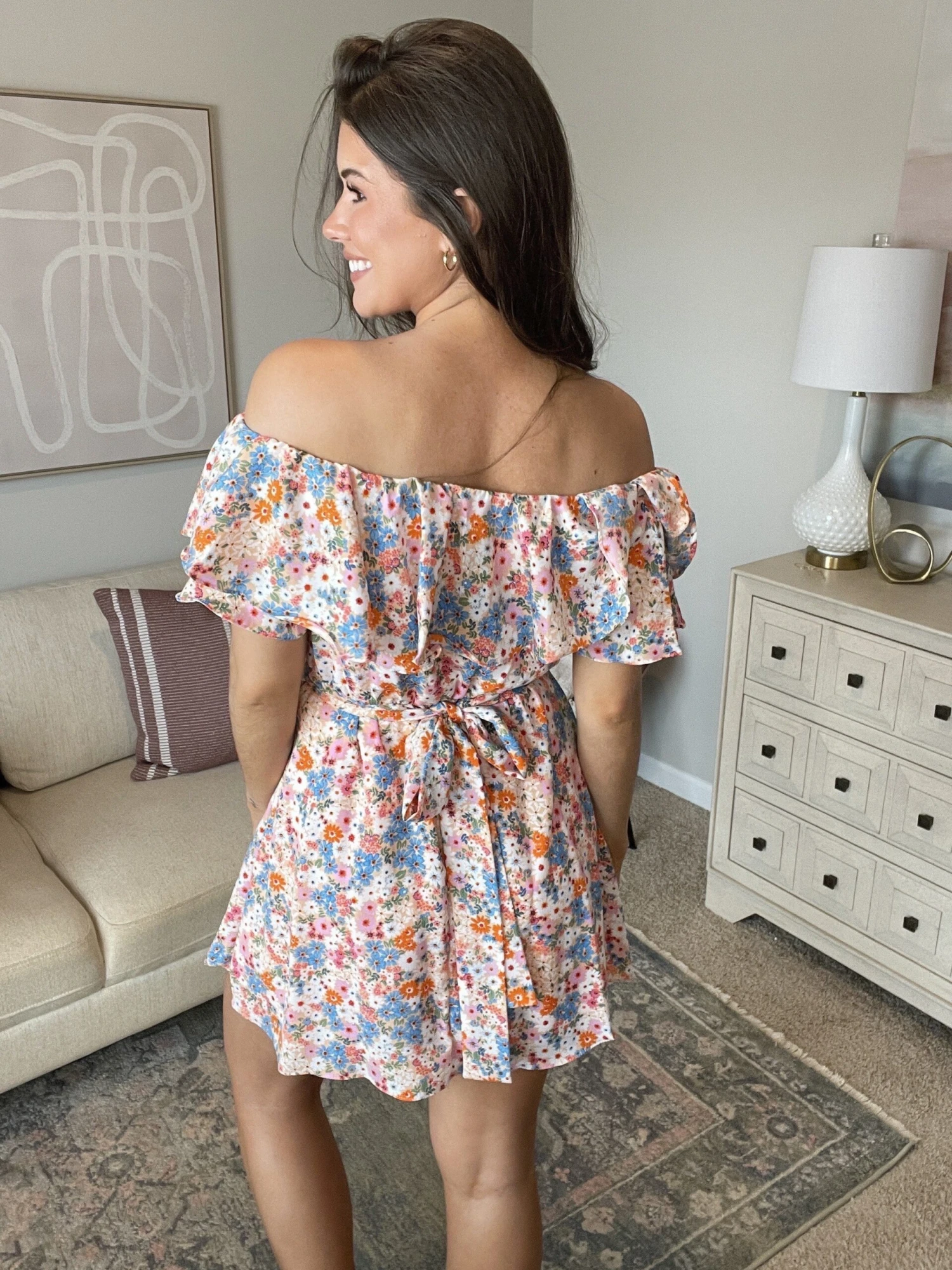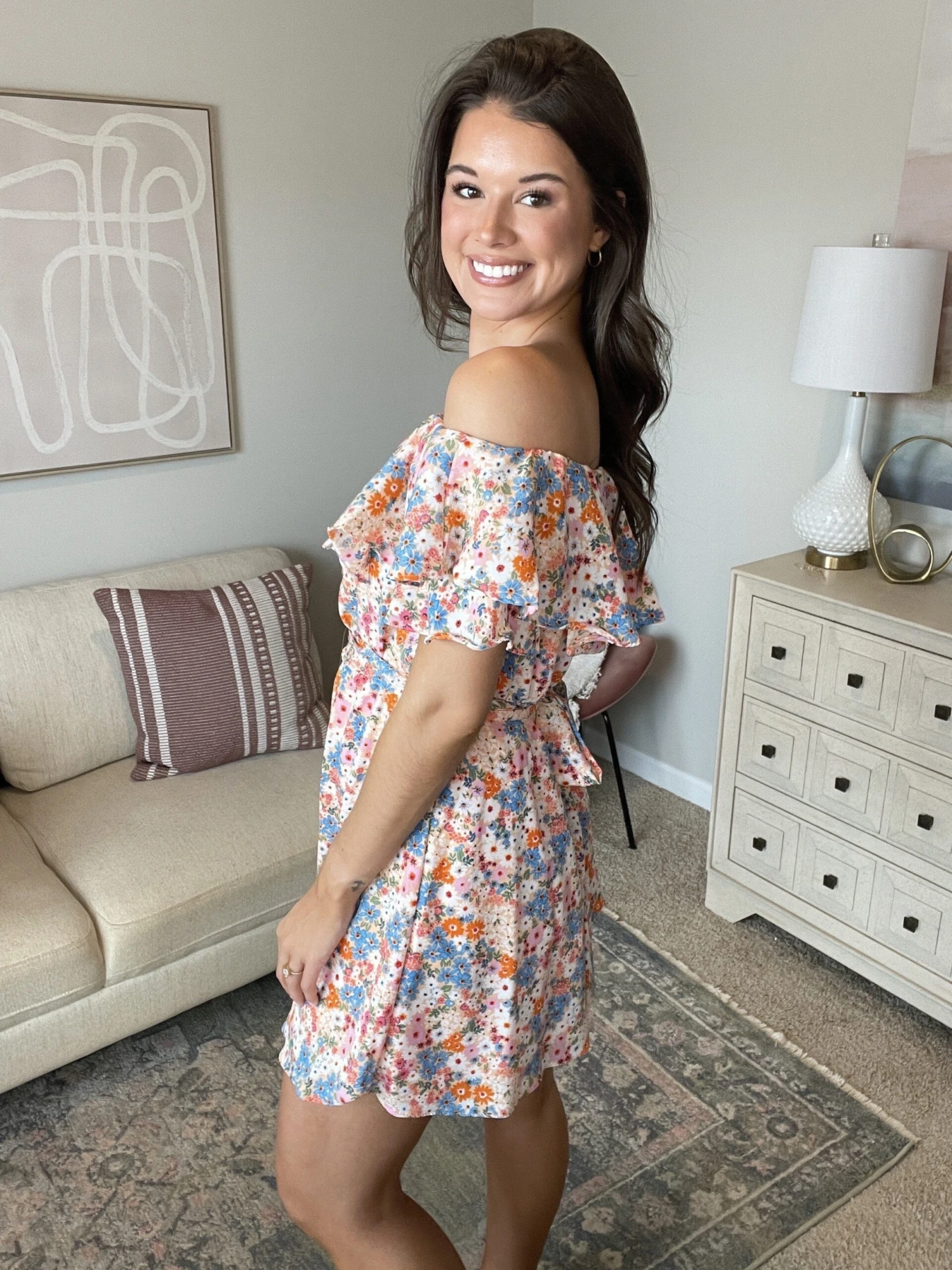 Features: floral print, off the shoulder, ruffle detail, waist tie belt