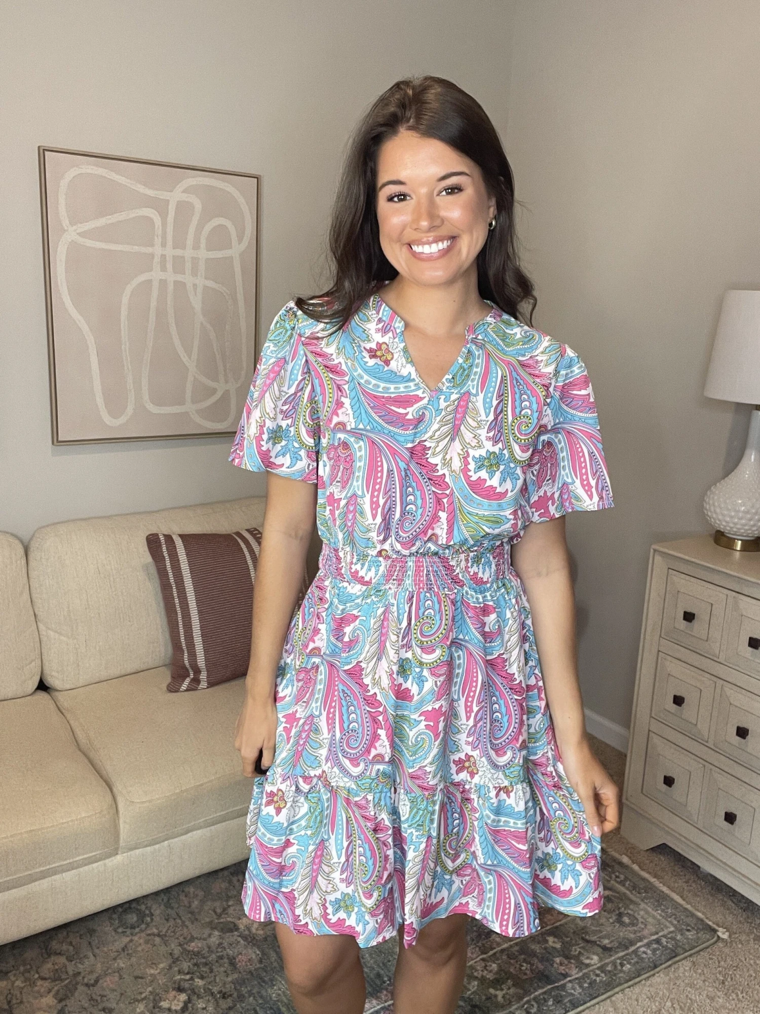 Paisley Print V-Neck Smocked Waist Dress | S – 3X