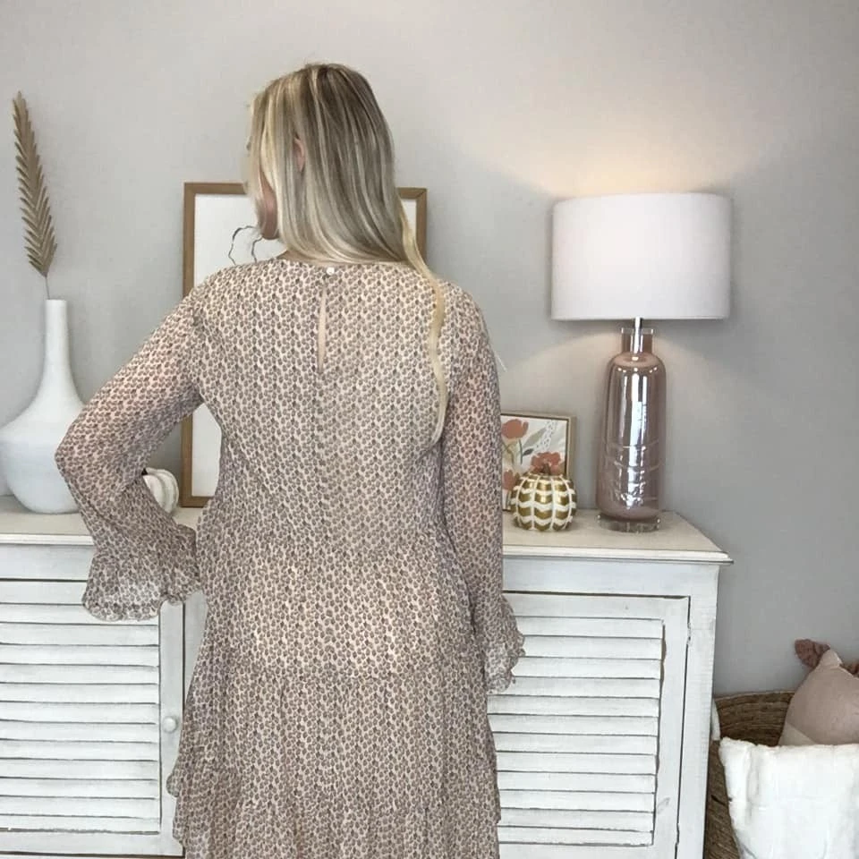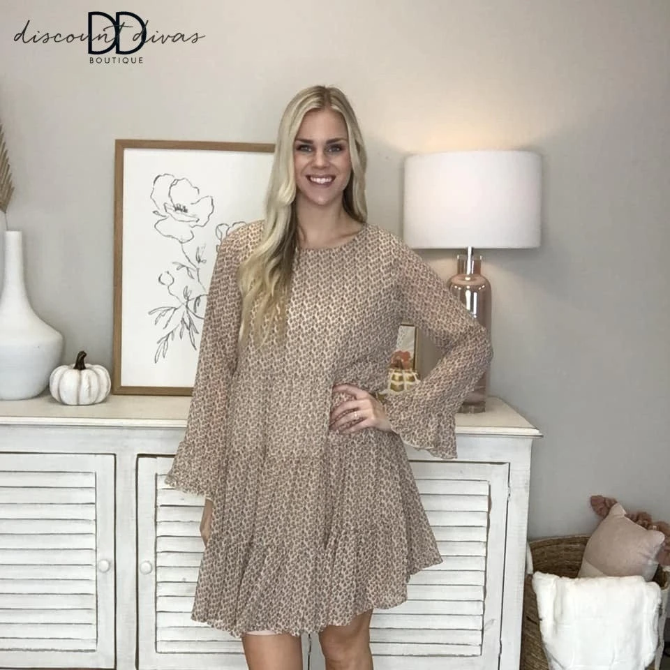 Features: babydoll, tiered dress, long sleeve, floral print, round neck, ruffle detail on sleeve