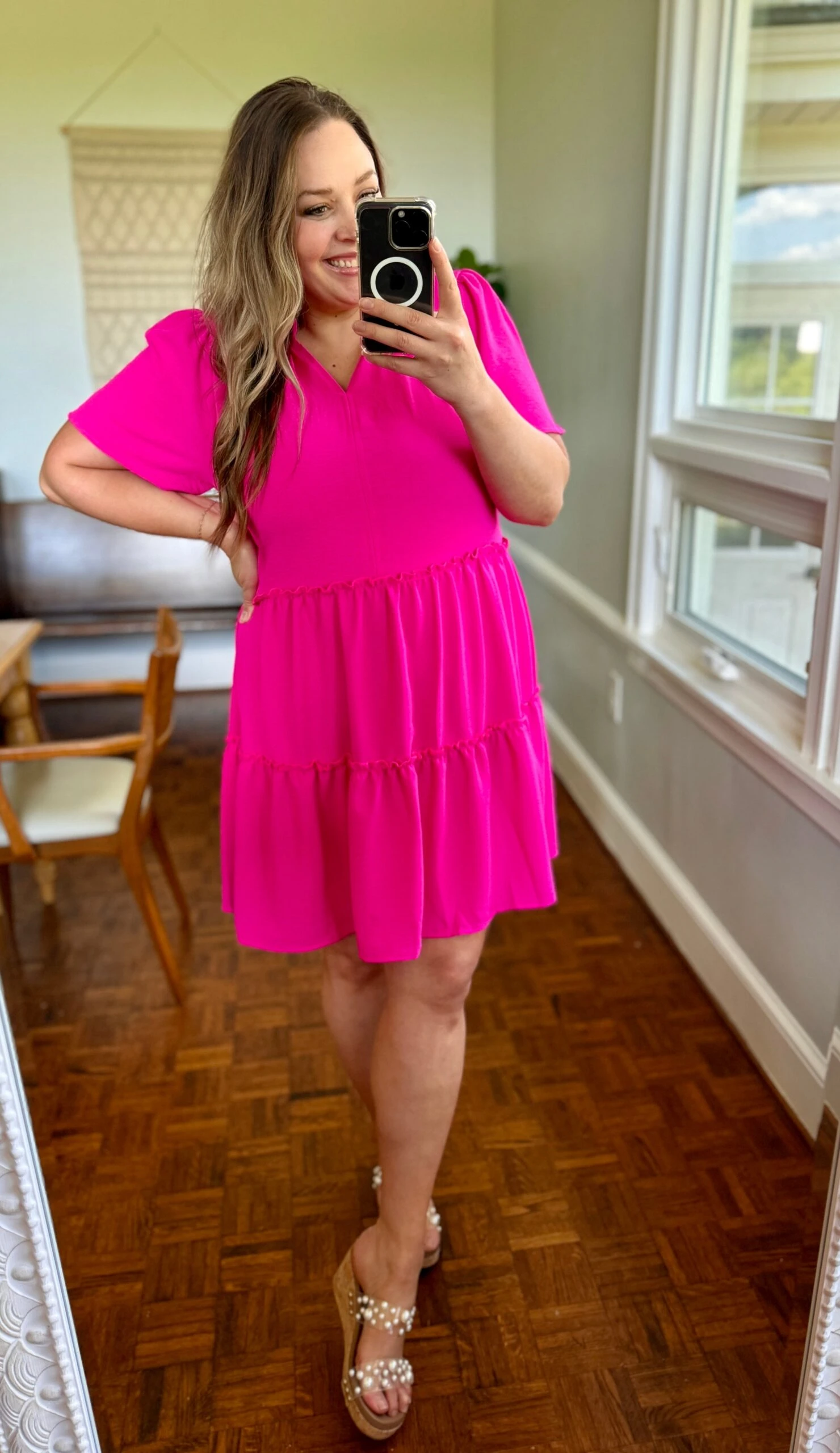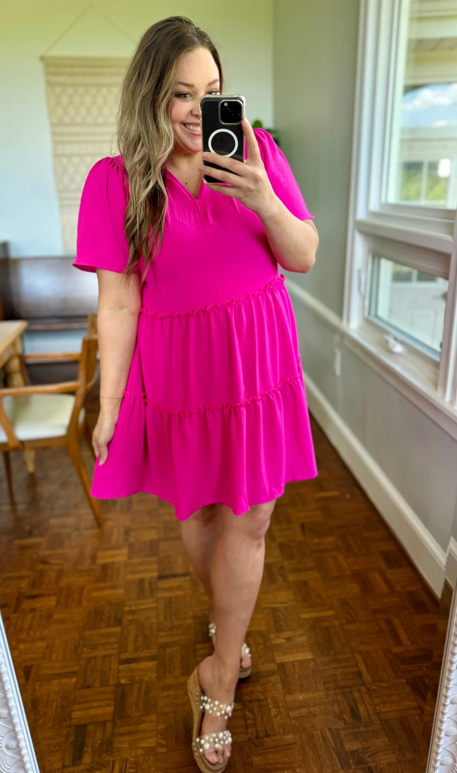 Short Sleeve Split Neck Tiered Short Dress | S-3X