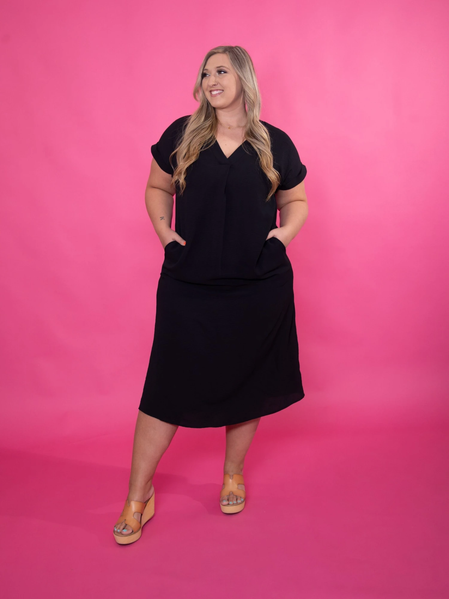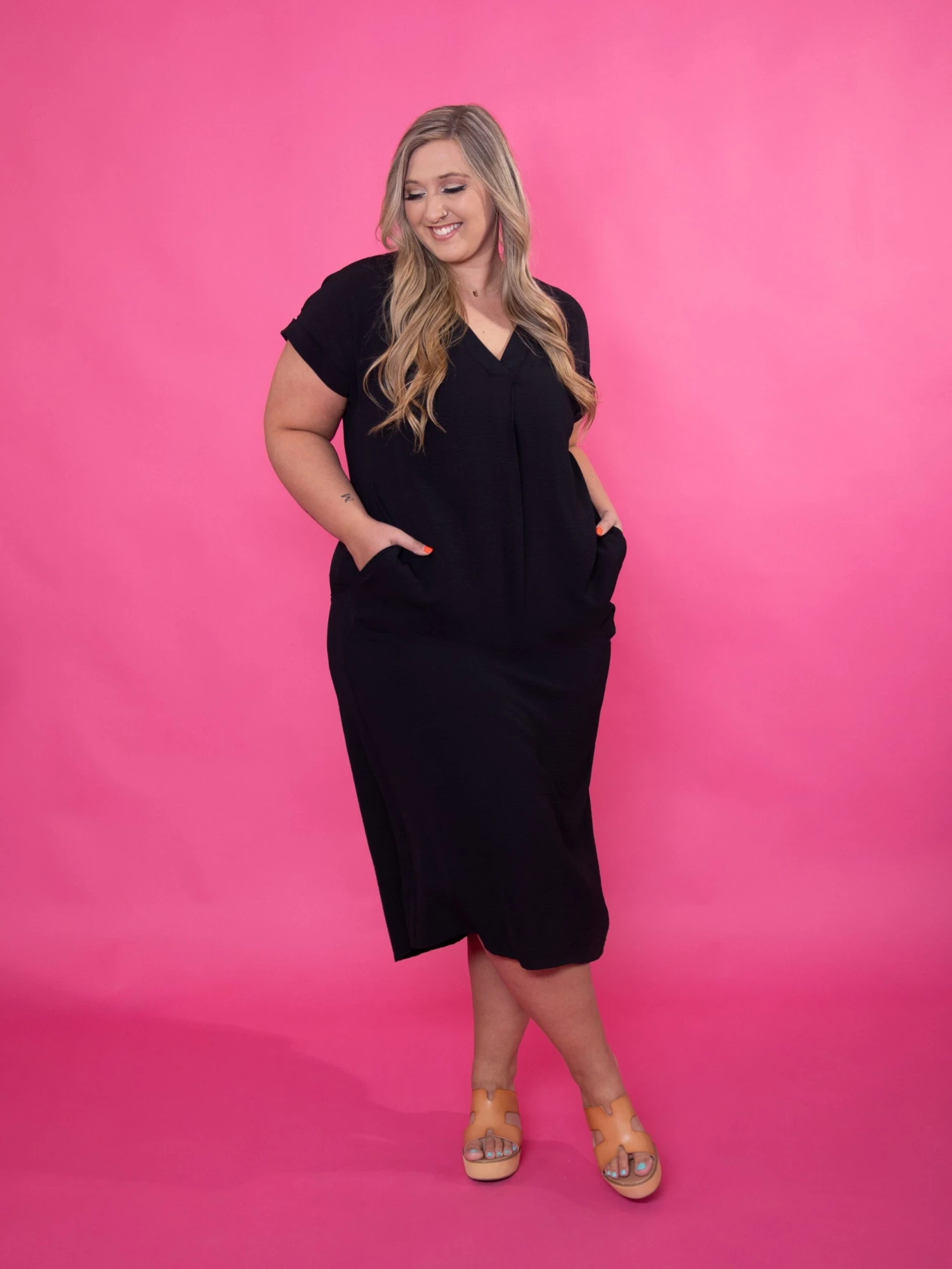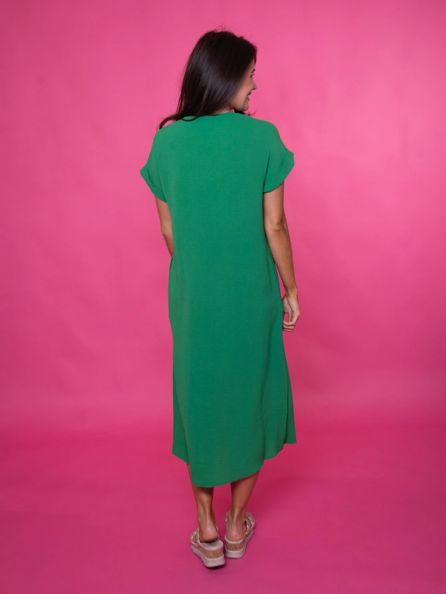 Features: V-Neck, Short Sleeve, Midi, Pockets