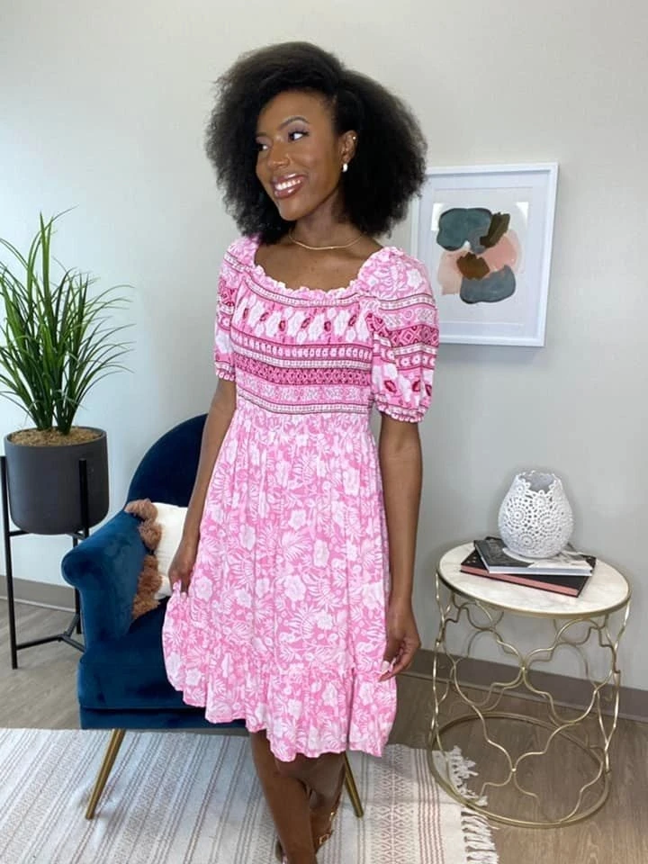 The “Toast To That Dress” has arrived! This printed baby doll dress is a must have! With a smocked top and ruffle hem, you cannot go wrong! These bold colors are perfect for the summer! Pair with sandals and you are all set!