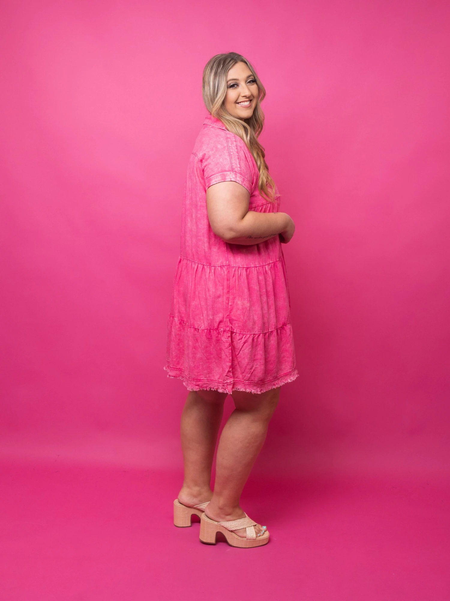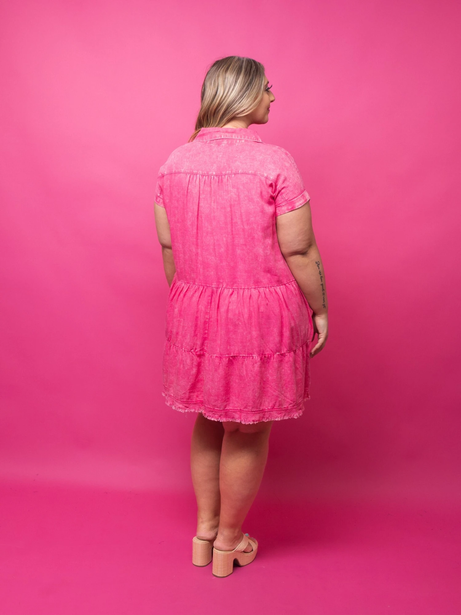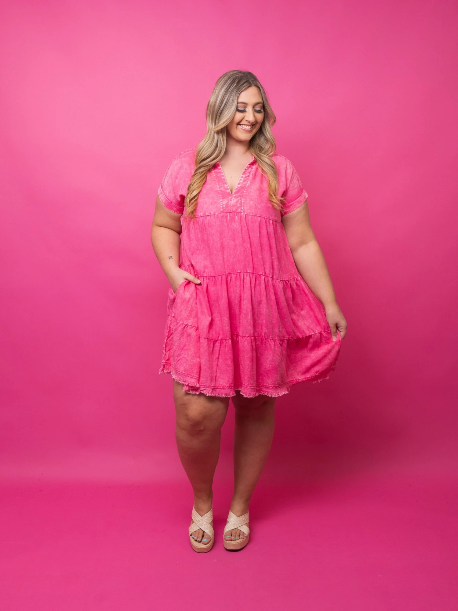 Features: Short Sleeves, V Neck, Tiered, Raw Hem